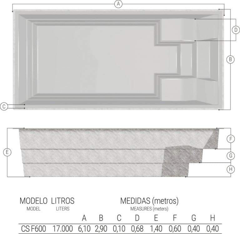 Um projeto ambicioso, em que a inovação dos métodos construtivos foi fator fundamental para tornar realidade essa obra prima. Seu lindo design conta com duas espreguiçadeiras acopladas, as quais possuem uma ótima ergonomia e conforto. Inspirada em modelos amplamente vendidos no mercado europeu, essa piscina já é um sucesso também no Brasil. Está disponível nas cores azul e branca.
